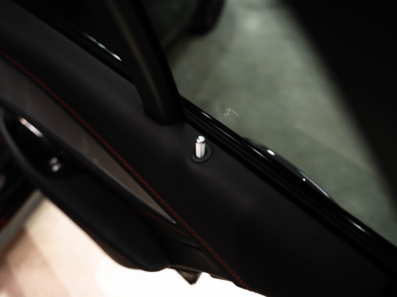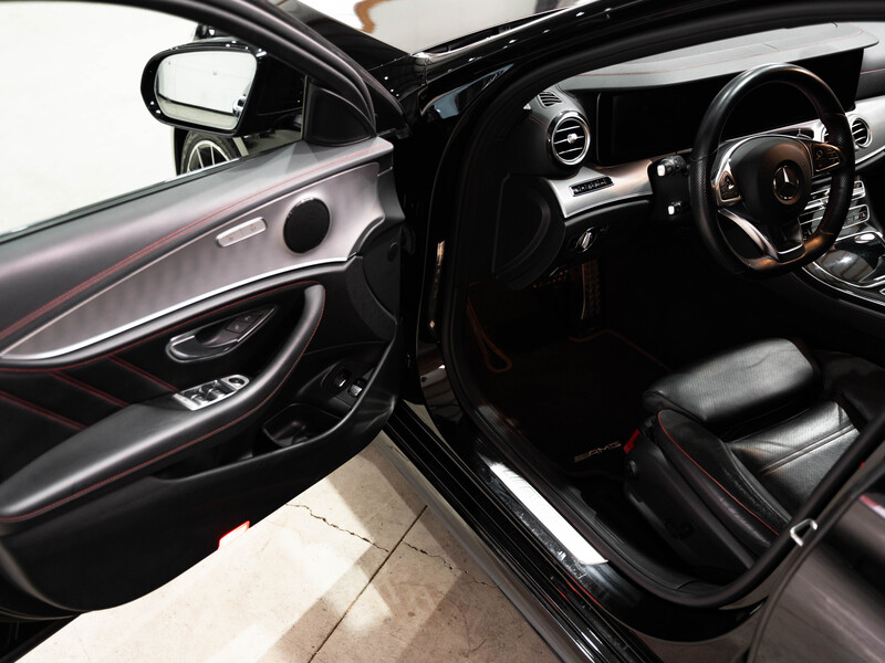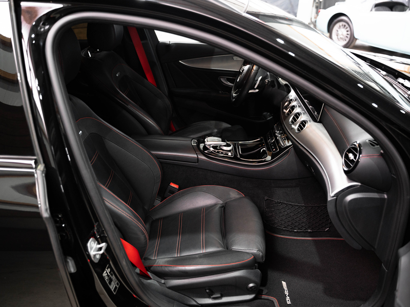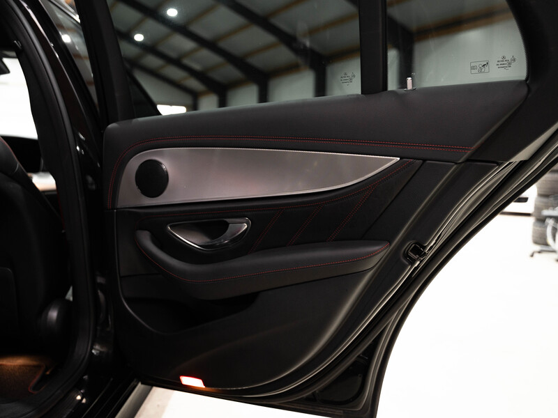 2017 Mercedes-Benz E43 AMG T-Modell 4Matic in Obsidianschwarz Metallic mit einer schwarzen Volllederausstattung mit roten Ziernähten und roten Gurten.