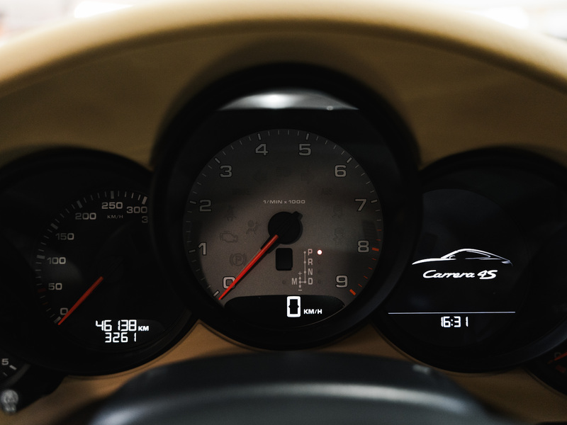 Dieser umfangreich ausgestattete 991.1 zeigt sich in einer wunderschönen Farbkombination. Das Weiß in Verbindung mit der beigen Volllederausstattung samt Mahagoni Holzdekor ist sehr edel und hochwertig. Abgerundet wird die tolle Optik durch das Aero Paket.