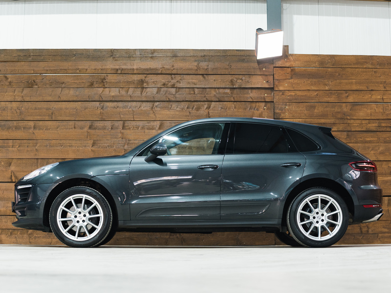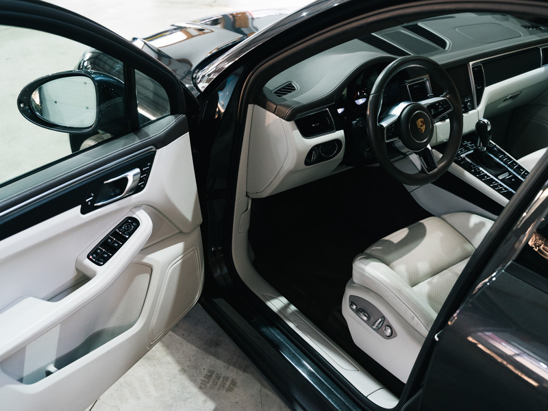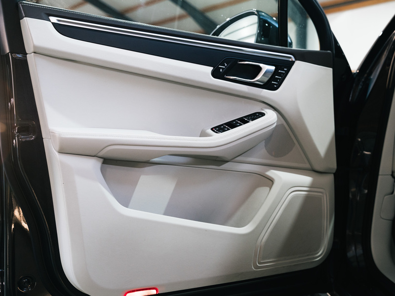 2017 Porsche Macan 2.0 in Vulkangrau Metallic mit einer zweifarbigen Lederausstattung in Weiß und Cocoa-Braun.
